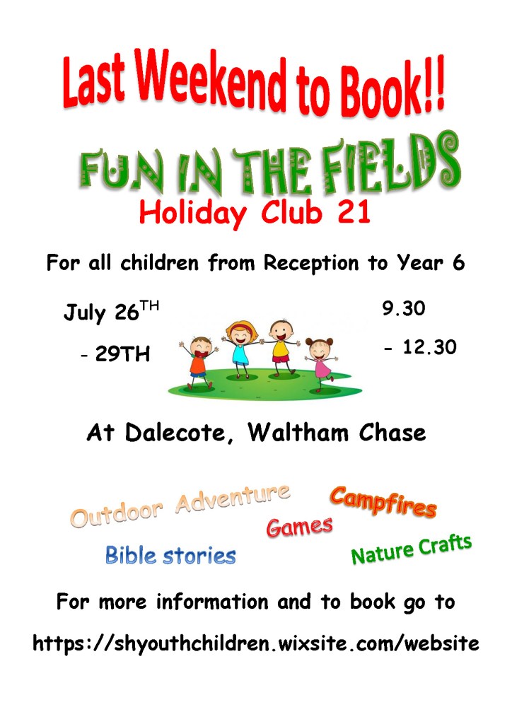 Details of this year’s Holiday Club ‘Fun in the fields’ July 26th to 29th : 0930-1230